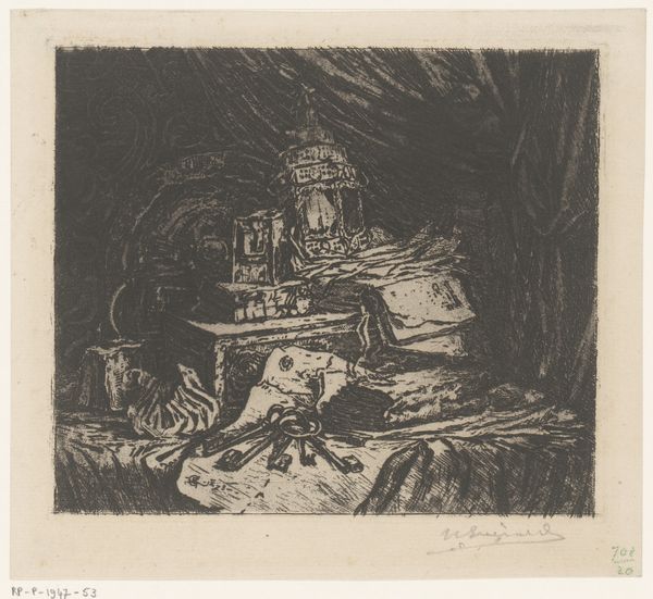 Editor: This etching from the late 19th century, titled "Hond met een nest jongen," depicts a dog with her litter. There's a real sense of quiet domesticity to it. What resonates with you when you look at it? Curator: The image is so rich in symbols of maternal care and domestic space. Notice how the mother dog is positioned – almost guarding, overseeing her pups. Think of the archetype of the "Good Mother," a nurturing, protective figure that’s been with us across cultures and centuries. It speaks to innate human and animal behaviors. Editor: Absolutely, there's something deeply primal about that protective instinct. Curator: And consider the interior. Not just any space, but one carefully delineated by the artist. The hearth, implied even if not explicitly drawn, acts as a visual anchor – representing the heart of the home, warmth, and family. Where else do you see such themes recurring? Editor: I suppose depictions of the Madonna and Child echo some of those themes, that connection to nurturing and care within a domestic setting. But with more of a focus on the sacred? Curator: Precisely! And observe how the artist uses light and shadow. Notice that the mother dog is quite clearly highlighted and her puppies are brought to our attention using these techniques of applying light, which evokes certain values attributed to motherhood. Can you suggest one? Editor: Well, they feel very present. Is the artist, through symbols, telling us that motherhood must be something significant in the cultural memory and continuity? Curator: It seems likely! This simple genre scene subtly reminds us of our own innate connection to family and home, echoed through archetypal visual cues. What’s something you learned? Editor: That even a seemingly simple image like this can hold so much cultural meaning beneath the surface. Curator: Indeed. It prompts us to question how images create our emotional responses and the values our culture impresses upon them.