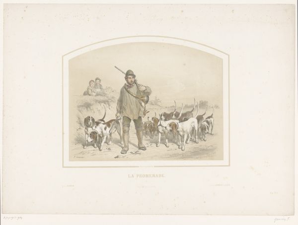 Editor: Here we have Joseph Louis Leborne's "Ram, twee schapen en een herdershond," dating from 1828 to 1829. It's a print, an engraving, really. I find the stillness of the scene quite striking. The dog especially looks alert and almost regal guarding the sheep. What do you see in this piece, considering its time? Curator: Well, beyond the immediate depiction of pastoral life, I consider how this image might have functioned within the broader visual culture of 19th-century Europe. Prints like this were widely circulated. How might this imagery reflect or shape prevailing ideas about the relationship between humans, animals, and the land? Consider the burgeoning urban centers. Were such idyllic images serving a nostalgic purpose? Editor: That's a really interesting point about nostalgia. It's easy to just see farm animals, but thinking about the rise of cities, this image of rural simplicity would definitely have had a different kind of appeal, a longing, maybe even an invented tradition of an ideal past? Curator: Precisely! And who was the intended audience? Was it primarily an urban population seeking an escape, or was it aimed at reinforcing existing social hierarchies in rural communities? Furthermore, how might we analyze the visual rhetoric employed here – the postures of the animals, the composition of the landscape – in terms of power dynamics and social roles? Editor: So, not just about animals, but maybe the distribution of wealth, land use, industrialization… it really changes my whole perspective. Thanks for pointing that out! Curator: It is just a reminder that even seemingly simple genre scenes such as these can be rich sources for understanding the complex interplay of social, economic, and political forces at play in any era. It is about power!