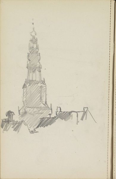 Curator: Looking at Cornelis Vreedenburgh's "Tower of the Old Church in Amsterdam," created sometime between 1890 and 1946, what's your initial impression? Editor: It has an airy quality, almost like a ghostly apparition against the stark page. The artist opted for a light touch with the pencil. Curator: Indeed, the choice of medium and technique directs our attention to the artistic process. The artist's hand, the specific grade of pencil used, and the texture of the paper become paramount in understanding the piece. It's interesting how a seemingly simple drawing encapsulates such a rich engagement with materials. We are looking at the physical, constructed nature of representation. Editor: And what does that representation tell us about Amsterdam's cultural and social history at this time? How does this tower function as a symbol, within a civic context, in relationship with religion, power, and artistic movements? The Oude Kerk itself, as a physical site and an institution, holds centuries of layered meaning. The choice to depict just the tower, rather than the full church, invites consideration. Curator: Precisely! What was the economic climate for artists producing cityscapes at this time? Were they dependent on commissions from wealthy merchants, or engaging with a broader market? The relative simplicity of this work and the accessible medium implies an interesting dynamic in art patronage. Editor: And who might have been the intended audience? Was it for personal study, public consumption, or for sale as souvenir or tourist material? The Tower, being a key civic landmark, may communicate a broader visual identity that artists participated in shaping. Curator: Thinking about materiality and labor – did the artist create this *en plein air*, grappling with the elements and social encounters, or was it a studio recreation from preliminary sketches? Understanding those decisions tells us about the physical realities shaping artistic production. Editor: I'd also look into archival photography and maps of Amsterdam at that time. Visual parallels can illuminate artistic and historical processes—documenting material culture beyond this image. What architectural alterations were occurring in the tower or its immediate environment? Curator: Very insightful. Both materiality and social history work together to construct a powerful artistic moment. Editor: Yes. We can deepen the conversation through multiple lines of investigation. It offers more than meets the eye.