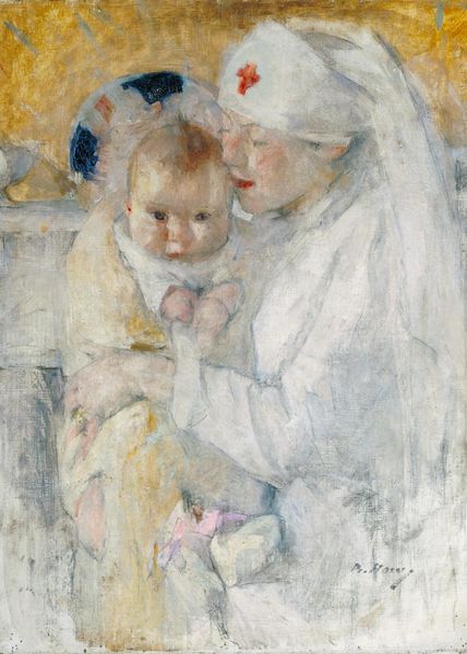 Editor: Here we have Renoir's "Gabrielle and Jean," painted around 1895. It's an oil painting, portraying a woman and child at play. There’s something incredibly soft and intimate about it, mostly because of the rounded brushstrokes. What strikes you most when you look at this piece? Curator: Primarily, I observe Renoir's manipulation of form and color. The composition itself adheres to a somewhat classical pyramidal structure, grounding the figures. Note how the brushstrokes blend colors rather than sharply defining contours, which achieves that very softness you mentioned, dissolving the distinction between figure and ground. The figures seem almost to emanate from their surroundings, yet the composition is stable. Is this pictorial strategy an accident? Editor: Not at all, it appears very intentional. But, why blend these two, figure and background, which may confuse some viewers expecting classical order? Curator: Perhaps to suggest a harmony, a merging of subject and environment, reflecting the comfort and familiarity within this domestic scene. It's also important to note the textures; the juxtaposition of the smooth skin of the subjects against the textured brushwork of the background creates a tactile quality. And if we closely analyze the treatment of light, we observe that it is less about direct illumination, but more about atmospheric diffusion and creating soft tonal shifts. Note how light interacts with the folds of their clothing, almost blurring those lines. Editor: I see how Renoir's technique and treatment of color, texture and light emphasizes an overarching intimate feeling of daily life within his compositions. It seems I had only scratched the surface. Curator: Indeed, by examining the intrinsic elements of painting we may find greater understanding.