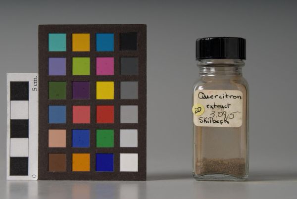 Curator: I find myself drawn to the unexpected poetry in this image—a seemingly mundane vial of "Dry Titanium Oxide" by Samuel Cabot Inc. Editor: It strikes me as a study in contrasts. The clinical, almost scientific presentation juxtaposed with the promise of vibrant color. Curator: Absolutely. The color checkerboard alongside hints at the sociopolitical weight this pigment carries in art history. Its impact on whiteness, purity, and even censorship. Editor: And isn't it fascinating how a simple label transforms the object into a signifier of industry, of a very specific historical moment in Boston? It becomes a symbol of production, commercialism. Curator: Precisely. This work invites us to examine the intersection of artistic creation and the capitalist structures that enable—or constrain—it. Editor: Seeing this image has helped me to appreciate how even the most humble substances can be loaded with meaning. Curator: For me, it is a reminder that artistic narratives are inextricably woven into broader social and economic fabrics.