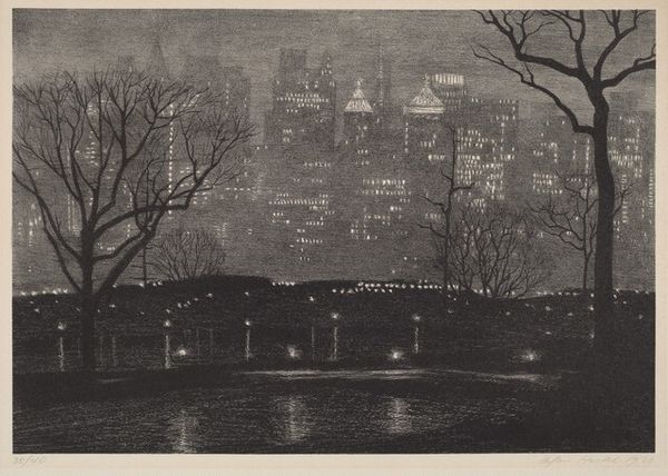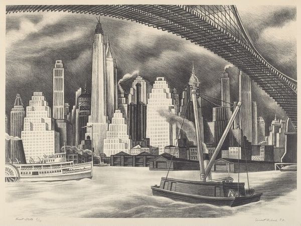 Editor: This is Paul F. Berdanier’s "Brooklyn Bridge," an etching from around the 1940s. There's something really striking about how the bridge looms in the foreground, almost menacingly. What jumps out at you when you look at this piece? Curator: Well, my first thought is always, what secrets does this bridge hold? I imagine each of those little lights as a tiny window into countless stories, of lives crossing from Brooklyn to Manhattan, or maybe trying to get away from it all. There's also a fascinating interplay between the geometric precision of the bridge's structure and the almost impressionistic rendering of the water, isn't there? It’s a dance between order and chaos. Don’t you think so? Editor: Absolutely, the rigid structure against the fluid water is beautifully contrasted! And you're right, the stories it could tell. Curator: What I find especially engaging is how Berdanier used light in the artwork. Look at those bold, deliberate lines scratching to bring the architectural shapes to life in etching. Don't you think they are a powerful representation of hope against darkness, a testament to human innovation in the face of, shall we say, urban melodrama? Editor: Definitely. The lights feel almost defiant. Do you think the choice of black and white adds to that sense of drama? Curator: In this urban nocturne? Absolutely. It strips away the mundane, focusing us on the fundamental tensions. Night becomes an active character. By the way, who, for you, would pass through this print-window? Editor: Someone looking for a fresh start, maybe. Or just a great view. Thanks, that's a new way of seeing it for me. Curator: My pleasure! And for me as well. It is prints like this, my friend, that inspire a great love in the simple yet endlessly challenging life in the metropolis.