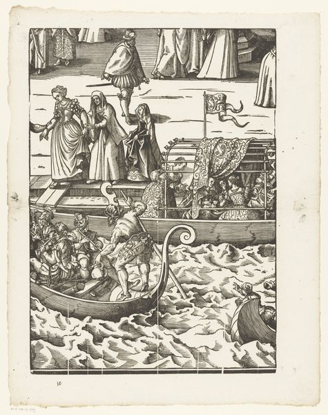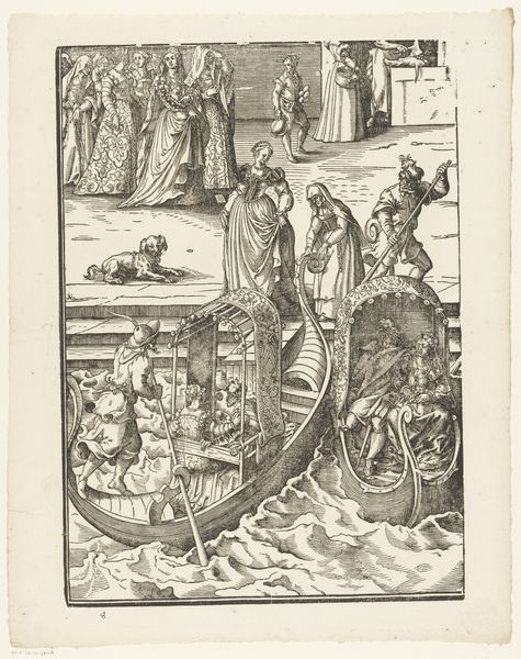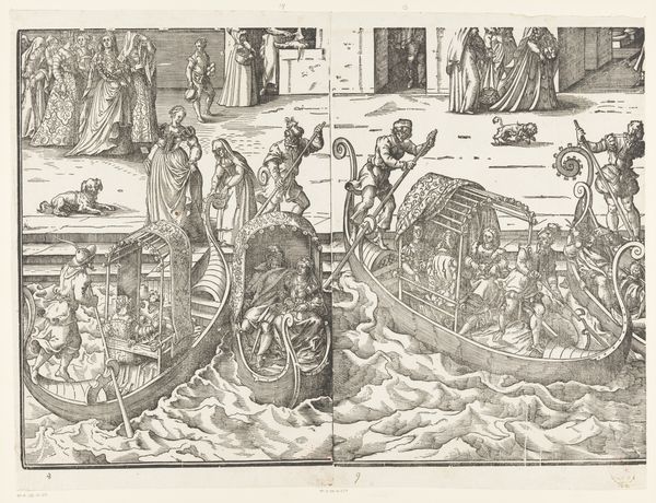 Curator: Here we have Jost Amman's "Festa della Sensa (elfde gedeelte)," created around 1679. This print is currently held in the collection of the Rijksmuseum. Editor: The dynamism in the piece is the first thing I notice, especially in how the waves are visualized. The scene pulses with an almost restless energy. Curator: The composition is meticulously arranged, directing the eye sequentially, starting from the static gathering above to the active chaos of the boats on the water below. Note Amman's impressive use of hatching to give volume to figures and objects. Editor: It’s a visual representation of controlled chaos. The symbol of Venice, so often serene and elegant, is presented in an almost turbulent state. Do you see a specific reading of Venetian power and identity embedded here? Curator: Power in the arrangement of pictorial elements. The diagonal lines of the boats juxtaposed against the more regimented group on land is not an accidental juxtaposition, it conveys the theme. We read from structure what its values may be. Editor: It suggests to me a complex relationship between the state and its people, represented through this ceremony on water. This annual "Festa della Sensa" depicted was rich in symbolic meaning, celebrating Venice’s maritime dominance and its marriage to the sea. Is Amman pointing towards the performative and symbolic language of governance? Curator: Potentially. And while the content of the image points us toward the symbolism and representation, do not underestimate the interplay of light and shadow that contribute to the artwork's spatial depth, or the geometrical figures at the top of the image, which play a very critical role in its structural balance. The contrasts and the repetitions are deliberate artistic decisions that demand exploration. Editor: Absolutely. By capturing the nuances of Venetian culture and power through his work, Amman ensured that visual symbols carry layers of cultural memory for viewers today. A beautiful intersection of ceremony, statecraft, and the sea. Curator: Precisely. Amman showcases how an event can be visually transformed into more than just its constituent parts. He lets the architecture speak for itself and invites further investigation by the meticulous composition, and stark black-and-white contrasts of this historical documentation.