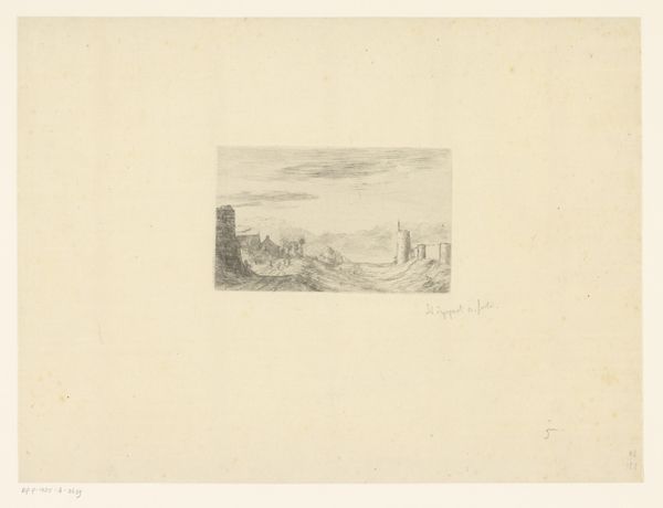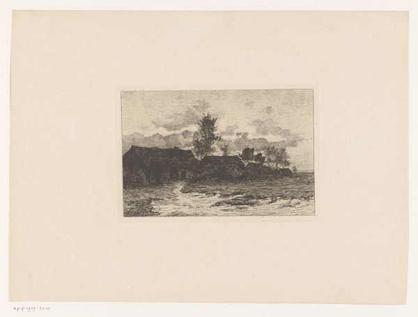 Curator: Welcome to this subtle etching, "Molens te Schaarbeek bij het vallen van de avond," or "Mills at Schaerbeek at nightfall," created around 1879-1880 by Jules Dieudonné. Editor: My immediate impression is of quietude, almost melancholy. The print's subdued tones and the subject—windmills at dusk—create a still and somewhat somber mood. Curator: Precisely. Notice how Dieudonné utilizes the etching technique to establish value—how shadow and light interact within the scene. There’s a tonal richness within what initially appears a monochromatic palette. Editor: I think that somberness resonates with the historical context. These windmills represent a way of life that was gradually being industrialized and displaced by the burgeoning factories in late 19th-century Belgium. There's a poignant undercurrent about the impending end of an era. Curator: Yes, but the piece moves beyond mere lament. See how the horizontal bands unify the work structurally, giving equal importance to land, windmills, and sky. There is something grounding about the balanced composition. Editor: But look closer—aren't those smokestacks in the distance? They're subtle, but to me, they suggest an intrusion upon this pastoral scene. It subtly reminds me of that moment when our present intrudes on memories and challenges idealized pasts. The rural landscape becomes an intersection for different historical narratives, including histories of colonialism. Windmills such as these ground grain from far away to feed working populations in Belgium and across Europe. Curator: That friction is certainly present, yes. The piece presents the rural within a society actively engaged in massive urbanization. Editor: Indeed. These windmills aren't merely picturesque structures; they're cultural landmarks grappling with the realities of progress and changing times. Curator: An era rendered as texture, light, and shade, offering viewers a lens into both industry and landscape, a subtle yet powerful social commentary through the close inspection of form. Editor: The way the artist situates that reality between an appreciation of pastoral and rural beauty, with industry lurking in the background. Curator: Beautifully said. Thank you for offering that layered perspective.
