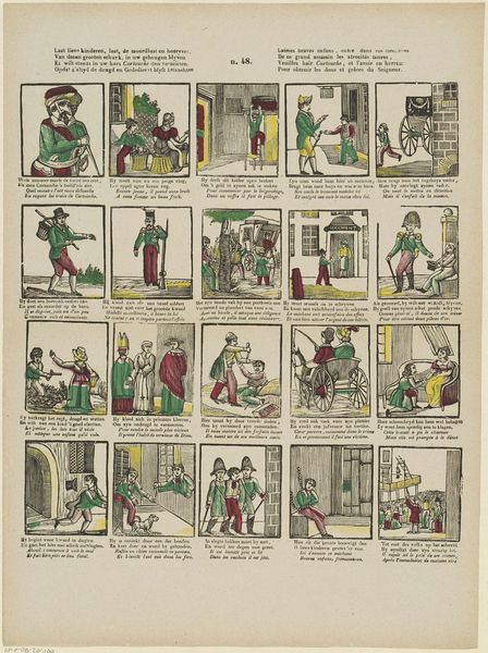 Curator: What strikes me about this piece – this little story-print from the 1820s or 30s by W. & J. Hissink, titled roughly "This print is worth double the money: Where Cinderella from the Hearth... Became exalted to Princess" – is the almost frantic energy it gives off. It’s like a tiny stage packed with drama. What do you see in it? Editor: It’s interesting that you call it "frantic." I saw something comforting in the familiar tale, though told in these almost chaotic little boxes, like a proto-comic strip. It feels very... Dutch, somehow. Very genre painting meets folk art. I'm wondering, how much were these images intended for children? Curator: Ah, a wonderful question! Considering the period and the presence of text alongside the images, it probably catered to a broad audience – families reading the story together, perhaps. I'm tickled by the awkward grace of the figures and the rudimentary perspective. They seem more interested in getting the story across than any academic realism. Isn’t there a raw, almost feverish quality to the romantic idealism at play here? It makes one feel like finding magic in daily existence isn't such a silly endeavor after all. Editor: Yes, the figures do have a certain… earnestness. I suppose knowing it was made in the Romantic period puts the sentimentality in perspective. You start thinking about yearning and longing – that desire to find magic as an escape from the mundane! Curator: Exactly. And in our time, with so many glossy, expertly crafted images assaulting us, maybe there’s something genuinely refreshing about this unpretentious little thing. It's a nice reminder to embrace the quirks and imperfections! Editor: It’s certainly given me a new appreciation for the pre-digital storyteller.