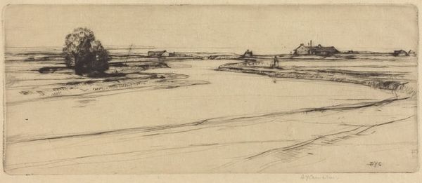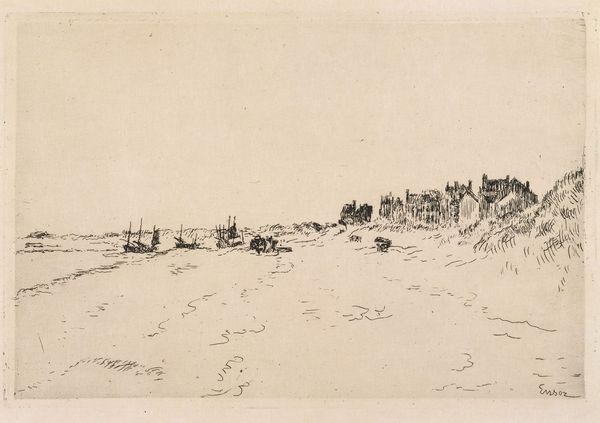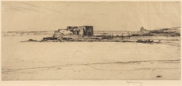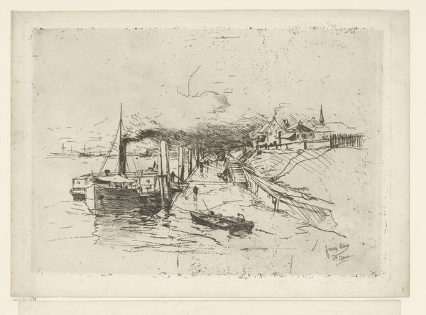 Editor: So, here we have James McBey’s "Morning, Catterline," an etching made in 1909. It’s a detailed coastal scene… There are figures on what appears to be a pier, with boats scattered around the water. The scene is quite subdued; I get a sense of the everyday life of a fishing community. How do you interpret this work? Art Historian: Thanks for sharing your initial impression. Immediately, the work conjures thoughts about labour, specifically how landscape becomes inextricably linked to labour and livelihoods. Looking at Catterline, we should be asking: who are these figures occupying the pier? And whose stories are excluded from the romanticised landscapes? Editor: That's a perspective I hadn't considered! It's easy to get caught up in the aesthetic and miss those stories. So the artist, as a man, had a specific point of view. How does this shape what we see, or don't see, in the landscape? Art Historian: Precisely. Consider McBey's position within the context of early 20th-century Scottish art. He romanticizes, yes, but what realities are obfuscated? We should also explore the political economy of fishing in Scotland at the time and the experiences of women, children and migrant workers. Editor: I never thought of landscapes this way, they always just seemed, well, pretty. But this opens up a whole new avenue for analysing art and society together. Thank you! Art Historian: And thank you! Because understanding landscapes as political projects and never as simply, “pretty”, provides the pathway for future interrogation, as well as the inspiration for further, necessary disruption.
