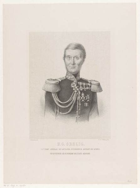 Editor: So, here we have a portrait of Frederik III of Prussia, created around 1840 by Friedrich Jentzen. It's a lithograph, almost a daguerreotype quality to it. It strikes me as a very formal and perhaps even intimidating depiction. What's your read on this? Curator: Notice the stark black and white contrasts; this emphasizes the hierarchical symbols on display. Look closely at the helmet—a classic, almost iconic, Prussian symbol of military might and authority. Do you see how its deliberate placement invites the viewer to contemplate themes of power, duty, and lineage? Editor: Yes, I see that now, how the helmet isn’t just an accessory but an important, imposing element. Curator: Exactly! The way he holds it also speaks volumes. It's not worn, it's *presented*, suggesting not just military strength, but a considered display of power. Furthermore, the single point of light seems carefully positioned to reflect off the helmet's metal, adding to its mystique. How do you interpret that conscious choice? Editor: Maybe it’s highlighting the burdens that come with the power and title… kind of like a "heavy is the head that wears the crown" situation? Curator: Precisely! It echoes centuries of artistic and cultural associations linking armour, power, and responsibility. This image is not simply about Frederik; it’s about perpetuating a very specific *idea* of leadership. Are we meant to fear him, or admire him? Or both? Editor: I never would have picked up on all of that just looking at it initially. Thanks, that was enlightening! Curator: My pleasure. Seeing how these images communicate through symbolic language is crucial to understanding not just art, but how societies construct and maintain their power structures.
