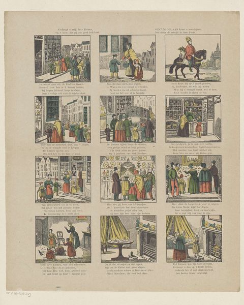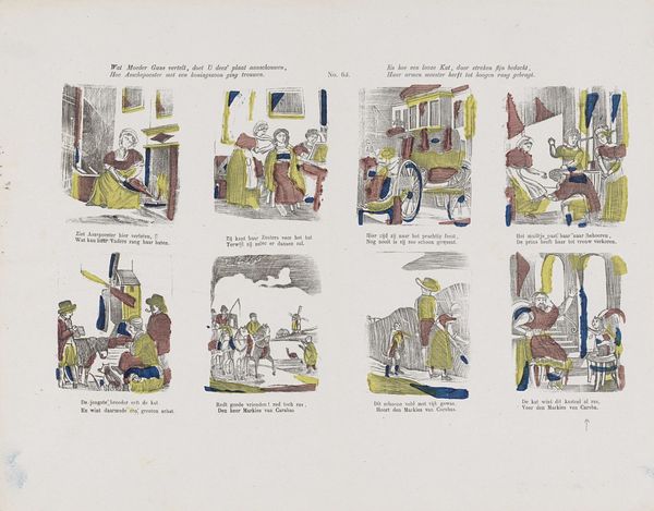 Editor: This print, created by Lutkie & Cranenburg between 1848 and 1881, is titled "What Mother Goose tells...". It seems to depict various scenes from fairy tales, almost like a comic strip from that era. What social and historical narratives can we glean from this artwork? Curator: This piece reflects the burgeoning print culture of the 19th century and the growing accessibility of storytelling through visual media. The choice to illustrate well-known fairy tales suggests a desire to disseminate popular narratives, likely aimed at a burgeoning middle-class audience seeking accessible forms of entertainment and moral instruction. Consider the role of "Mother Goose" as a cultural touchstone – what does it signify about the values being transmitted to children through such readily available prints? Editor: So, the print served a purpose beyond just amusement? Curator: Absolutely. The choice of tales, their simplified presentation, and the very act of mass production point to a concerted effort to shape cultural values and create a shared imaginative landscape. The commercial aspect is vital too: prints like these fostered a market for affordable art, contributing to the professionalization of artists and printers and creating a visual vernacular understood by a large swathe of the population. What impact did prints like these have on art styles that would follow it, like ukiyo-e and other popular art prints? Editor: I never considered its commercial importance before. Thank you, I’m starting to see it as a crucial piece of media that helped build a new idea of society through affordable art. Curator: Indeed! It underscores how art serves not just as aesthetic experience, but also as a conduit for cultural values and social aspirations.