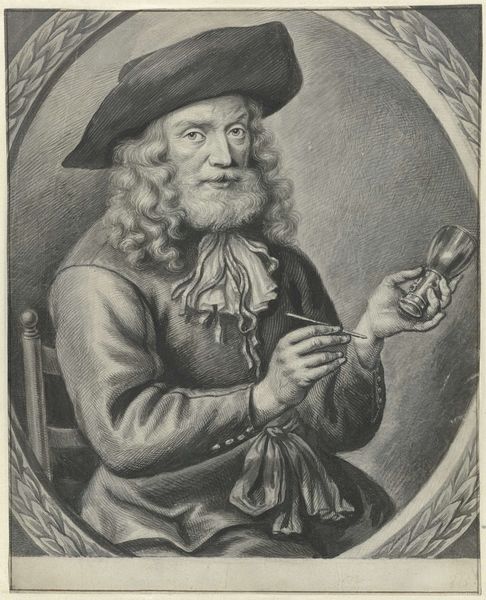Curator: This is a portrait of Petrus Scriverius, made before 1816 by Nicolaas van der Worm. It is a print, more precisely, an engraving. Editor: It's strikingly etched, those lines creating such depth. There is a softness to the face that defies the medium. Curator: The choice of engraving, specifically, I think speaks volumes about how society viewed knowledge production. Here’s this technique reliant on meticulous, almost industrial precision used to preserve the likeness of an intellectual. We might read it as enshrining not just Scriverius, but also the labor of crafting his image. Editor: Definitely, the labor is palpable; look at the detail in that hat! But let's consider Scriverius himself. What was his role, and how does that affect our viewing experience? Curator: Scriverius was a noted scholar. His life and work existed at the intersection of scholarship and civic engagement. Therefore, depicting him with such intense detail elevates not only the man but also the societal value placed on knowledge and learning. The print medium allows for wider distribution of his image and, therefore, wider dissemination of the values he embodied. Editor: I see your point. It connects to the notion of reproducible media enabling access, aligning with his role. Curator: Indeed, this portrait also reflects certain performative aspects of identity of being a scholar. What can that specific wide-brimmed hat, paired with the dignified pose, say about the image Scriverius intended to project and about the social expectation imposed on intellectual figures? Editor: Considering the engraving technique, its comparative replicability underlines how material processes extend not only to crafting the artwork itself but also constructing reputations and ideals. Curator: It invites us to reflect on art’s role in affirming societal norms, even unintentionally. Editor: Absolutely. Reflecting on this, the lines composing the face become an inventory of the social functions assigned to him, made literal by the engraving. Curator: In closing, reflecting on Scriverius, it becomes evident that his impact stretches far beyond that, offering valuable insights into the intellectual landscape of his time. Editor: Yes, and thanks to the act of creating a replicable object with such meticulousness, our insights today gain extra meaning.