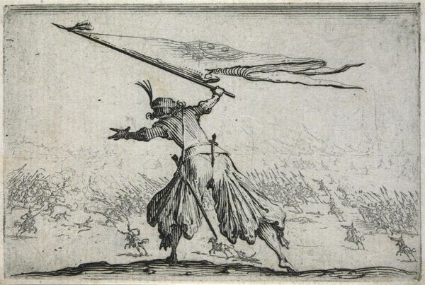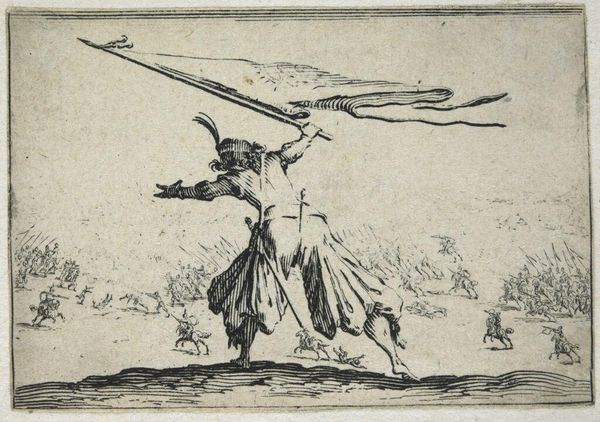 Curator: This is Jacques Callot's "Duel with Swords and Daggers," a small etching measuring about 5.7 by 8.3 centimeters, currently residing at the Harvard Art Museums. Editor: Right away, I feel the tension! It’s incredible how much movement and aggression Callot conveys in such a compact space. Look at their bodies coiled like springs! Curator: Callot was a master printmaker, renowned for his skill with the etching process. The fineness of the lines suggests a meticulous and time-consuming labor, probably utilizing a very hard ground. Editor: Exactly. I think we can almost hear the clash of steel. The costumes are incredible; what a statement through fashion! This image speaks to conflicts then and now, don't you think? Curator: Indeed. Callot's works often reflect the social realities of 17th-century Europe, where honor and violence were intertwined, and were often available as affordable prints, thus consumed broadly across society. Editor: Seeing that sort of conflict captured in such a diminutive piece makes you consider the weight of history, doesn’t it? I walk away feeling rather thoughtful, and definitely tense!