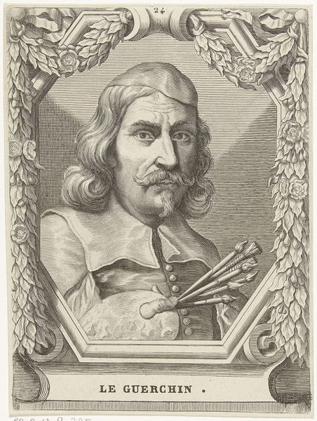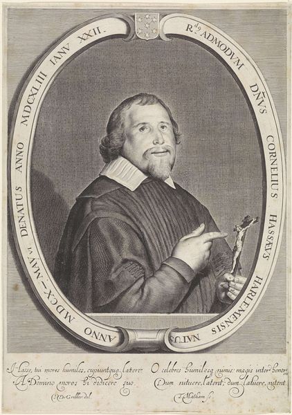 This is Cornelis Visscher's engraving of Adriaen Motmans, a detailed portrait rendered with meticulous lines, capturing a sense of contemplative solemnity. The composition is structured within an oval frame, immediately drawing the eye to Motmans himself. The texture achieved through the hatching and cross-hatching technique adds depth and volume to the figure, setting a somber tone. The formal arrangement invites a reading of signs and symbols. On the left, scientific instruments and books are placed, while on the right, a skull. These are compositional choices that frame Motmans within a discourse of knowledge and mortality. These semiotic devices, while traditional, invite reflection on the convergence of earthly pursuits and spiritual destiny. The artist uses these formal elements to create a space where representation transcends mere likeness. It engages with broader philosophical inquiries about life, death, and the pursuit of knowledge, mirroring the complex relationship between the material and the transcendental.
