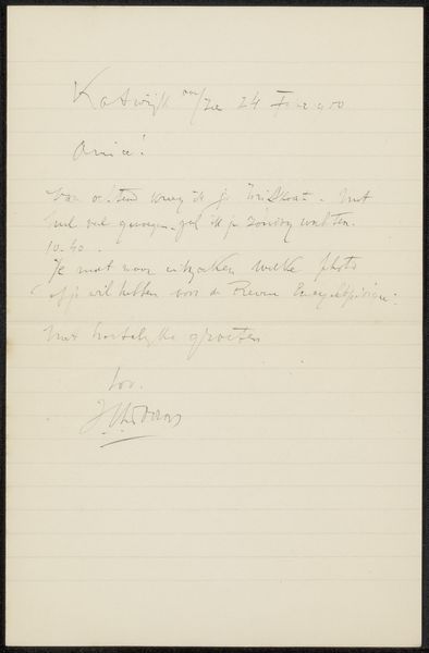 Editor: Here we have Richard Nicolaüs Roland Holst’s "Brief aan Anna Dorothea Dirks," likely from 1893, rendered in ink on paper. What strikes me is how this personal letter becomes a kind of art object through the artist's hand lettering and the hotel stationery. How does the historical context affect how we interpret a piece like this? Curator: That’s a very astute observation. Considering the historical context, this isn't merely a personal letter, but a window into the artistic circles and social structures of the late 19th century. Holst, embedded within the cultural elite, utilizes this letterform not just for communication but as a display of intimacy and perhaps even status. Think about it, writing on hotel stationery suggests a certain level of affluence and social mobility. Editor: So, the choice of writing paper says something about who he is trying to present himself to be? Curator: Precisely! The very act of hand-lettering, in an age of increasing mechanization, underscores the value placed on craftsmanship and individual expression within the Arts and Crafts movement that was blooming at the time. It’s a deliberate rejection of mass-produced communication. This letter becomes a statement about artistic identity within a specific socio-economic context. What does this make you think about the “intimism” tag in the metadata? Editor: I see… The intimacy isn't just the personal message, but also in the deliberately hand-crafted form in defiance of the rise of printed communications. It becomes a symbol of personal connection in a rapidly changing world. Curator: Exactly. And consider the recipient, Anna Dorothea Dirks. What role might she have played in Holst’s life or artistic network? This simple letter opens up broader questions about artistic patronage, relationships, and the public role of what might seem like a private document. Editor: I had never considered a letter as being tied to the cultural politics of the era. Curator: Right. Analyzing seemingly minor ephemera like this sheds light on the intricate interplay between art, society, and personal expression, doesn't it?