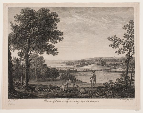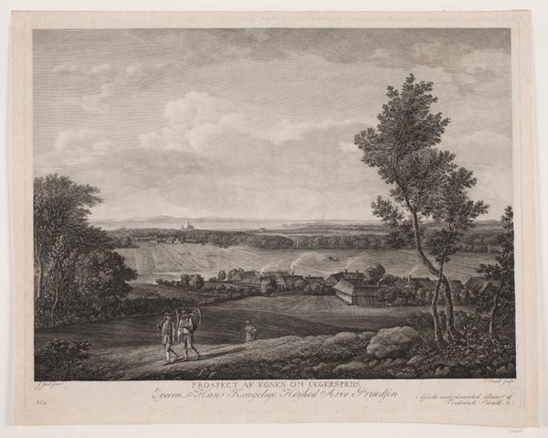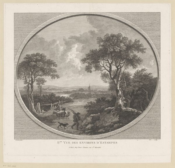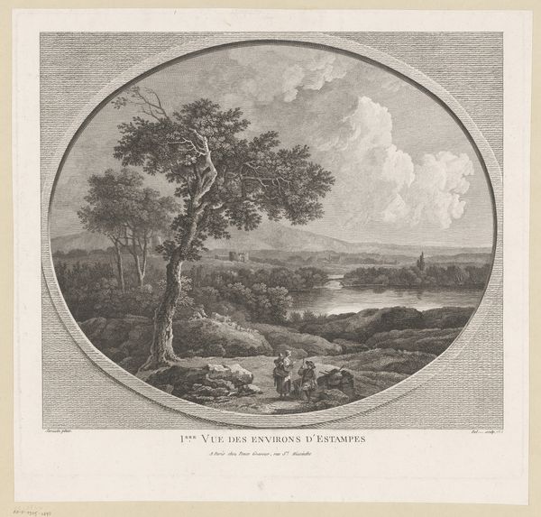 Editor: This is "View of London from Hampstead Heath" by Daniel Lerpinière, likely made between 1780 and 1786. It's an engraving, so a print. What immediately strikes me is the contrast between the industrious figures in the foreground and the distant, almost ethereal cityscape. What do you see in this piece? Curator: Indeed. Initially, observe how Lerpinière employs a classical oval frame, imposing structure. The composition follows a clear visual hierarchy. Note the sharp distinction between foreground, middle ground, and background, creating depth through tonal variation. Editor: It’s interesting how the light catches the clouds in the distance. It is mostly shades of gray with limited dynamic range, yet the clouds are highlighted using the contrast to give an illusion of drama. Curator: Precisely. Now, consider the function of the framing device. It's not merely decorative, it acts as a lens, focusing our gaze and setting off against the rectangular paper around the composition. Are the structural contrasts more subdued without it? Editor: I hadn't thought about that. Without it, the picture plane flattens a bit, I think, and some of the visual tension is lost. But why use this visual device in this picture specifically? Curator: We can speculate. Perhaps Lerpinière is creating a deliberate visual echo. How might that interplay between the geometrical structure and the depicted pastoral ideal be read? It isn't clear in the visual information that the piece contains. Editor: So, by examining these formal choices, we gain a richer understanding, even without specific historical details. It reveals intent! I wouldn't have looked so closely at the framing initially. Curator: And that, in essence, is the power of formalism, offering another perspective of the image as a cultural object. I think one more look to imprint the framing device and its purpose in the memory is very worthwhile.