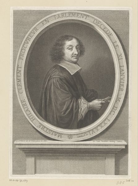Curator: This is a print from 1650, titled "Portret van Pierre de Bertier," created by Gilles Rousselet. It's an engraving and a striking example of Baroque portraiture held here at the Rijksmuseum. Editor: Immediately, I’m struck by the intensity of his gaze, even across centuries. The detail is astonishing for an engraving – the textures of his clothing and the intricate shadows. There’s a contemplative, almost melancholic air to him. Curator: The very act of commissioning a portrait, then as now, was a marker of social standing, even more so rendered with such ornate style during the height of the Baroque. Rousselet's subject becomes part of a visual discourse surrounding power and status, complicated, in this case, by Pierre de Bertier’s evident religious status marked by the garments, thus demanding an intersectional consideration of class, religion and its privileges in the era. Editor: Indeed. Note the prominence of the cross, subtly displayed but undeniably present. Its weight, visually and symbolically, speaks volumes. The oval frame itself is a symbol of protection and eternity, framing him not just physically but also within a concept of enduring memory. Curator: How do you think the religious implications play within the context of Baroque visual rhetoric? What tensions emerge, for you? Editor: The formality and restraint – consider the color palette of grey tones of this print only - suggest a negotiation of power. The Baroque aesthetic often employed drama and opulence. Yet, the print limits its ornamentation which I believe underscores an interesting negotiation between humility, spirituality, and the unavoidable demonstration of status through art. He appears as if posed for the court even though the symbol and look seem humble at the same time. Curator: I’m compelled by the intersectional dynamics at work. Is there space to think through how art creation contributes to canon-building and who benefits from cultural depictions like these? Editor: Undoubtedly. It invites consideration of who is remembered, whose image endures, and the narratives these images perpetuate or even seek to obscure. His slightly turned head, almost looking back at us, evokes curiosity regarding what historical circumstances molded this man’s gaze. It leads to an important insight about how the past engages with our present concerns through material visual remains like this engraving. Curator: What critical reflection regarding canon is key when facing representations of power during these specific historical moments, as they shape societal consciousness even today. Editor: Yes, it compels us to actively and critically examine whose stories were promoted, whose faces became synonymous with posterity and by consequence which other gazes were omitted.