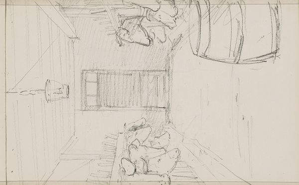 Editor: We're looking at a pencil drawing, "Ontwerp voor het interieur van de gereformeerde kerk te Vreeland," or "Design for the Interior of the Reformed Church at Vreeland," created around 1905-1906 by Carel Adolph Lion Cachet. The drawing feels fragmented, like glimpses of architectural elements captured quickly. What do you make of this work? Curator: The formal elements immediately present themselves. Note the artist's use of line – primarily straight, hard lines define the architectural space, yet there is a notable absence of tonal variation. The composition directs the eye across the page, prompting one to examine the relationships between forms such as the apparent window and what might be sections of a pulpit. Editor: I see. So the relationship between the lines is key? Curator: Precisely. Observe how the sparse rendering and open space between the forms create an impression of depth, without the reliance on traditional shading techniques. Also consider that the lack of color information focuses attention exclusively on structure and form. Are we looking at a complete interior? Editor: I suppose not, since there are floating pieces without much context. It almost feels like a collection of shapes at times, rather than an actual space. Curator: This raises an interesting question about artistic intention. The drawing offers an opportunity to consider pure form independent from contextual interpretation, suggesting the intrinsic value of geometry, space, and line as standalone aesthetic entities. Editor: It's interesting to see it that way. Focusing just on the lines and their relationships reveals more about how the space could feel. Curator: Exactly. By divorcing the design from color and detail, the artist encourages the viewer to engage with the fundamental architectural shapes. We can appreciate the sketch for the pure interplay of lines and the forms that emerge, regardless of its historical significance. Editor: I'm definitely walking away with a fresh appreciation for line and composition. Thank you!
