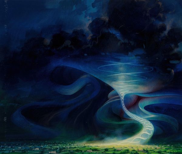 Curator: Here we have John Berkey’s "Tsunami," created in 1984. The artist utilized acrylic paint on canvas. It's quite striking. Curator: Absolutely. My initial impression is one of overwhelming dread and anxiety. It looks like a city being consumed, or about to be. The impending disaster looming above is powerful and evocative. Curator: I agree. When we examine Berkey's process with acrylics, we see thin layering and blending to create both transparency in the water and an almost surreal depiction of an urban space in crisis. Look at the sheer amount of visible brushwork. It's far from photorealist. Curator: True, this treatment connects with the symbolic nature of the scene. I can’t help but see it as a warning. In the context of the '80s, we’re looking at escalating Cold War anxieties, as well as an increased awareness of humanity's impact on the environment, especially given what a natural phenomenon such as a tsunami can do. Curator: Perhaps, but consider the craftsmanship involved in portraying light and reflection. The textures vary to give depth to the wave above and a ghostlike rendering of architecture submerged below. Even if metaphorical, that takes skill and planning. Did the process directly reflect this intention? Or was there more experimentation at play? Curator: Well, let’s not forget that cityscapes often symbolize power, wealth, and civilization. This image depicts that societal hub meeting its demise at the hand of something far greater than itself, prompting necessary dialogue about the potential repercussions when social structures disrupt nature’s natural order. It echoes longstanding societal debates regarding sustainability versus industrial advancement, highlighting vulnerability and questioning the value placed on capitalistic gains versus basic survival. Curator: I find it interesting that the labor invested creates an apocalyptic scene; all that material skill going towards a symbol of potential societal collapse through climate change or global conflict—however intentional that was or wasn’t. Curator: The artwork makes us think critically about both how these forces have affected us in the past, and how these circumstances influence and change how communities navigate risk, resilience, and collective well-being during difficult periods that reshape landscapes forever after devastating impact…it prompts us now to learn from them before facing inevitable repercussions brought by unsustainable acts within an interwoven framework requiring equity alongside ethical governance. Curator: The tension Berkey achieves through material choices reflects very clearly back to social and material structures and allows them a visual platform from where his skills help tell stories on different stages and perspectives—something anyone would respect at its essence… Curator: I appreciate your material breakdown; these visual interpretations spark critical dialogue across socioeconomic lines when approaching urgent conversations reflecting ecological justice when these conversations facilitate action on societal inequalities exacerbated during global disruption by highlighting actionable initiatives addressing past environmental harm affecting displaced communities as well