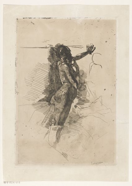 This is "Draperiestudies en een kop" by Jac van Looij, created using black chalk, white chalk, and charcoal. The initial impression is of an unfinished study in chiaroscuro. Van Looij masterfully uses white chalk to bring out the highlights on what appears to be draped fabric, contrasting sharply with the dark charcoal under-drawing. This interplay creates a dynamic sense of volume and texture. The composition appears somewhat fragmented. A man's head is cropped in profile to the right of the study. Above the head, preliminary sketches of hands suggest Van Looij was working out multiple compositional ideas simultaneously. This exposes the artistic process itself. Van Looij's rough marks and tonal variations are not just descriptive but also expressive. They invite us to consider the relationship between form and formlessness, between the finished work and the exploratory sketch. Ultimately, the piece challenges our expectations of finish and invites us to find beauty in the raw materiality of artistic creation.