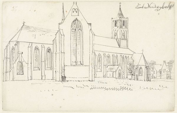 Curator: Before us we have "Gasthuiskerk te Doesburg," a pen and ink drawing on paper attributed to Cornelis Pronk, likely created sometime between 1701 and 1759. It's currently held at the Rijksmuseum. Editor: It feels so ephemeral! The delicate lines, the airy composition... almost like a memory fading into the landscape. I sense a quiet melancholy here. Curator: That resonates with the image’s possible function. These topographical drawings of buildings were often commissioned, serving as a means of documenting the architectural landscape of the time. The church here, then, might stand for something beyond itself. Editor: A visual record for whom, exactly? Wealthy landowners? The Church itself? We need to consider who had the power to commission and control these narratives. Whose perspective is being prioritized? Curator: Well, that’s where it becomes interesting because, though architectural renderings might suggest order, there’s a subtle dynamism to Pronk’s hand. He doesn't render a static, perfected church. Look closely: his quick strokes convey light, atmosphere, a lived-in feeling. And what of the Gasthuiskerk itself? It speaks of civic care, a tangible expression of communal responsibility... Editor: I’m seeing other echoes too... The Church as a refuge, a place of charity… Yet, haven’t such institutions historically perpetuated social hierarchies and inequalities? We can’t look at the beauty of the architectural details without acknowledging this complex and often contradictory history. Curator: Absolutely. And I’d add that those sharp lines evoke something lasting and indelible, despite that ephemeral quality you identified initially. A testament, perhaps, to the endurance of the built environment and its continued impact on the communities that have evolved around it. Editor: So it is not just about capturing physical presence. By recording this landscape, he's capturing the evolution of power and privilege, something always present in these "objective" records of a place and time. Fascinating! Curator: Indeed. I find the contrast between the fleeting impression and the enduring subject particularly evocative. Editor: A stark reminder that even seemingly objective observations are layered with subjective experiences and interpretations. Thank you for sharing.
