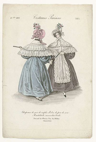 Jean Alexandre Allais created this fashion plate, titled 'La Mode', in France on July 19, 1834. It’s made with a combination of etching and engraving, and then delicately hand-colored. The print showcases the fashionable silhouette of the 1830s, emphasizing the luxurious materials available to the upper classes. “Pou de soie” translates to "silk taffeta," used for both bonnets and dresses. The lightness and sheen of silk taffeta created a sense of refinement. Note the meticulous detail in the lace trim and floral patterns, achieved through skilled handiwork, highlighting the importance of textiles in conveying status and taste. Fashion plates like this one fuelled the era's booming textile industry, employing countless artisans in the production of fabrics, lace, and embellishments. These images not only dictated style but also perpetuated social and economic hierarchies, shaping the desires and aspirations of consumers in a rapidly changing world. Recognizing the labor and materials enmeshed in this image reminds us of the social and economic forces that shape our aesthetic choices.