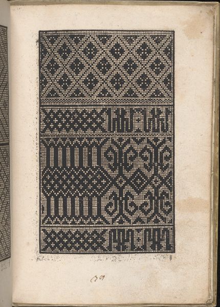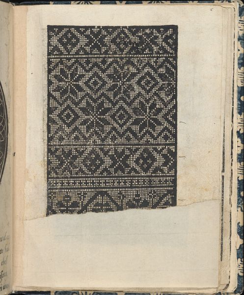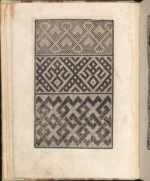 This is page 17r from "Eyn new kunstlich boich", printed in Cologne by Peter Quentel in the first half of the 16th century. It’s a woodcut pattern book, intended to provide designs for artisans and needleworkers. The image presents a series of geometric patterns, rendered in a stark black and white contrast that would have been relatively cheap to produce. These designs, featuring diamonds, stars and floral motifs, reflect the period’s fascination with symmetry and order but they would primarily be used as guides for various crafts, from embroidery to tapestry. In a pre-industrial world, these publications played a vital role in disseminating artistic ideas and standardizing visual culture across regions. The book itself is an artifact of a rising merchant class, eager to display its wealth through refined crafts and textiles. Studying the history of printing technology, combined with an analysis of sumptuary laws and social customs, can illuminate how such pattern books shaped the visual landscape of the Renaissance.