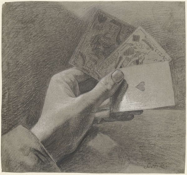 Curator: This etching by Gerard Jan Bos, titled *Self-Portrait at the Drawing Table*, dates to 1883. The monochromatic print shows the artist hard at work. Editor: The first thing that strikes me is the mood – it’s so somber and enclosed. There’s this density created by the dark lines, as if he’s shielding himself in his art. Curator: Precisely! That intensity might come from the loaded symbolism inherent in self-portraiture. The act of portraying oneself is an exercise in confronting identity, a theme further deepened by the intimate setting. We see Bos at his creative core, wrestling, perhaps, with artistic self-representation. Editor: And he’s literally surrounded by the tools of his trade—etching plate, tools—which all seems to point to art-making as a deeply private, almost hermetic process. Did Bos’s circumstances during this period shed more light on his mindset? Curator: Yes, looking at this through the lens of social history reveals much. Consider the rise of Realism in the 19th century, and its impact on depictions of artists. Bos seems to be turning away from romantic portrayals, showing us something starker, closer to a working man in his atelier, not a romanticized genius. Editor: He's drawing, presumably sketching out ideas for a drawing in this picture. Is that recursive, drawing one's self drawing something? How meta. The light focuses on his hands at work. Is this symbolic to how he may think he can impact the world the most? Through his art? Curator: Quite astute, your point about hands! Hands in portraits have long held symbolic weight; hands create, hands can destroy, but most significantly in a portrait, hands tell a narrative about labor and craft. This is why representing an artist’s hands can be so compelling. Editor: It is like seeing how his art is more than just for himself, that its hands on the process, of something being done and how that can be more than one's own self-image, it can also bring something more important, ideas maybe, from the drawing to other people. He does a wonderful job drawing, so humble to let the artwork display that fact. Curator: I find myself contemplating the cyclical process captured here; a creator creating an image of creation. Bos presents us with layered contemplation on artistry, existence and representation. Thank you. Editor: Absolutely, that has definitely brought forward the way the meaning behind "art" isn't just art but is creation, craft, labor and sharing!