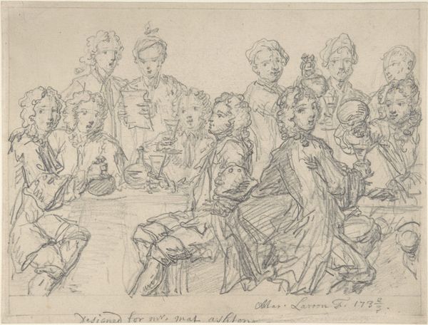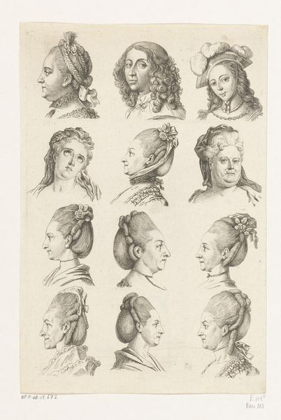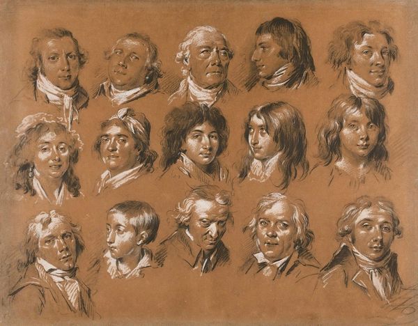 This drawing by Johannes Christiaan d'Arnaud Gerkens presents Charles Dickens amidst characters from *David Copperfield*, rendered in delicate lines and subtle gradations of tone. The composition, a cluster of portraits, might evoke a sense of literary intimacy, an invitation into the imaginative world of Dickens’s novel. Consider the structure of the composition, where individual portraits are connected through careful arrangement and tonal consistency. The faces vary in emotional expression, yet they are unified through shared tonality and similar techniques of hatching. This invites us to explore how the artist has used the formal elements of line and tone to evoke a cohesive representation of complex relationships between characters. The drawing functions not just as an illustration but as a semiotic exercise, where each face becomes a signifier of a character's traits and role within Dickens' narrative. Through these formal choices, the artwork prompts us to consider how it challenges traditional portraiture. It acknowledges how characters are constructed and interpreted through narrative, and how we continuously renegotiate meaning through form.