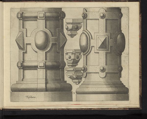 Curator: What a fascinating visual exercise. This is a print titled "Hele en halve piëdestal en vijf consoles, in de Toscaanse Orde," which translates to "Whole and half pedestal and five consoles, in the Tuscan Order," dating back to 1578. It's attributed to Johannes or Lucas van Doetechum and currently resides in the Rijksmuseum collection. The medium combines engraving, drawing, and printmaking on paper, focusing on architectural elements. Editor: Okay, immediately, I see a bunch of shapes. Stiff, architectural shapes. Like a blueprint if blueprints were... heavy. It feels very deliberate, very planned. I’m not feeling a lot of wiggle room here; more like "This. Is. The. Way." Curator: I think your gut reaction speaks to the sociopolitical implications. These formalized architectural plans are part of a larger 16th-century Renaissance move to re-establish "order"— a gesture away from more emotional Gothic structures toward the control of the classical era. The image, especially as a readily reproduced print, underscores the ways in which knowledge and power circulate. Consider the audience: Who could afford this level of planning, and who benefitted from enforcing particular models? Editor: That makes so much sense, because when I look at this design, it's strangely imposing. It wants you to build a Very Serious Building, right? I wonder how that aesthetic filtered down to the, shall we say, “common person's” shed, or home? What impact did that have on vernacular styles and ideas about beauty and proportion? Or to flip it, was this, itself, a representation of established building styles, set out for emulation by master craftsmen and home owners alike? Curator: Right, exactly! Think about who's shaping those perceptions—artists like the van Doetechums helped create and circulate those norms through their work. So, this seemingly “objective” architectural rendering carries a cultural and social load. Editor: Makes you think twice before you slap a random bracket onto a wall, right? Curator: Absolutely, it speaks to the underlying politics in ostensibly neutral forms. Editor: Okay, next time I'm hanging a shelf, I'll think of this image, and probably still hang it crookedly. Curator: Maybe that's an act of resistance? Editor: Now there's an angle I didn't anticipate! Thanks for that.