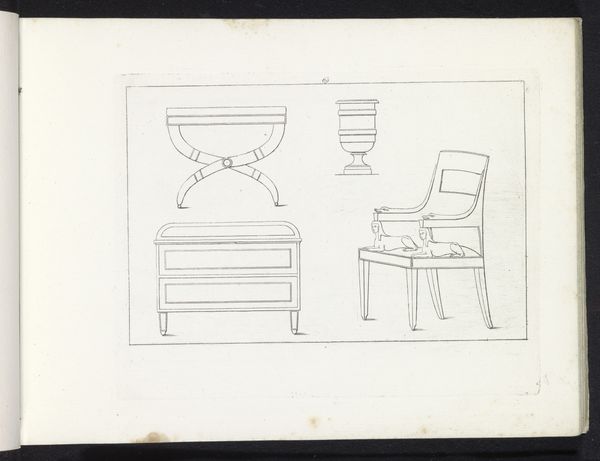 Editor: Here we have Pietro Ruga's "Bankje, twee stoelen en twee aanzichten van een tafel," created in 1817 with pen on paper. I'm immediately drawn to the archaeological feel; it reminds me of something Howard Carter might have sketched in King Tut's tomb. What do you see in this piece? Curator: Indeed, the Egyptian revival style is very present. Consider the date: 1817. This drawing emerges during a period heavily influenced by Napoleon’s Egyptian campaign and the subsequent publication of "Description de l'Égypte." How do you think that cultural phenomenon impacted the production of decorative arts and, crucially, the artist's choices? Editor: Well, it looks like everyone, including Ruga, was incorporating Egyptian motifs into everyday design! The hieroglyphs and stylized figures feel less like religious symbols and more like fashionable ornament. Curator: Exactly. And that appropriation raises some questions. Think about the role of the museum during this period. They were consolidating imperial collections and presenting them to the public. Does Ruga’s drawing engage with that process of displaying and consuming culture, or does it offer a critique of colonial consumption? Editor: Hmm, that’s interesting. Perhaps he’s both celebrating the style and subtly questioning the way Egyptian culture was being repackaged for European audiences. It almost feels like a flat-pack version of Egyptian design! Curator: Precisely! We have to consider not only the aesthetic choices but also the social and political environment in which they were made and consumed. This drawing isn't just about pretty furniture; it's about the power dynamics embedded in the act of looking and possessing. Editor: This makes me rethink my initial reaction! It's not just a casual sketch but a commentary on cultural appropriation and the role of art in shaping perceptions of the past. Thank you for sharing these reflections! Curator: My pleasure. And it reminds us to always ask whose history is being told and who benefits from its telling when engaging with art, whether old or new.