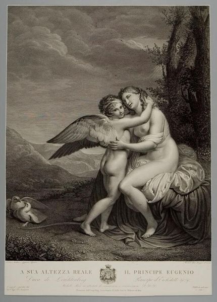 Curator: Immediately, the mood strikes me. Melancholic and intimate, no? The slumbering figures entwined evoke such stillness, yet within that frame, tiny people are trekking along under a crescent moon. The sheer narrative contrast—delicious! Editor: Indeed. This pen and ink drawing, a symbolic piece done in a Romantic style, can be attributed to Dante Gabriel Rossetti. The subject? A figuration dominated by two embraced figures. It begs to ask—is it one sleeping, dreaming, or are these figures perhaps separate, forever connected? Curator: Note the contrasting use of lines, where heavier, rhythmic marks create denser areas that enhance both mass and contour. Rossetti manipulates space through layered linework—but beyond that is a more imaginative depth created. Editor: True, the drawing presents a captivating contrast between realistic representation and stylized ornamentation. It also features complex layering; not merely superficial decoration. Rossetti is diving deep, embedding each object with a story to unfold. Do the people marching towards the moon perhaps tell one story, whilst those embraced characters suggest another? Curator: Ah, I'd say so. See how the bodies curve to lead us around, not into, themselves? Look again at how, even though the women seem to seek each other, they avert their eyes, each staring into a distinct void. Editor: Almost as if these two are together alone... fascinating, considering the Pre-Raphaelite obsession with medieval romance! You'd think, given all that love and pining, a bit more joie de vivre would be at play, somewhere... Curator: Romanticism isn’t about the good feelings of being in love as such. It uses this sensation to touch on bigger things like, beauty, feeling, being... so, it is quite perfect here. The work itself seems a contemplation on the nature of unity and solitude. Editor: Precisely. On one hand, the drawing portrays union through embracing. But, on the other hand, these women aren’t really present, and feel as far away as can be, especially through that otherworldly dreamlike atmosphere, heavy with sleep or longing. Thanks to your careful dissection, I can finally get a better feeling for what I see in this art.