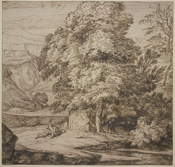 Curator: I’m struck by the delicacy of the lines in this work. The artist, Johannes Glauber, uses etching and ink to create an "Italian Landscape with Buildings, a Shepherd with Sheep on the Path, and Three Figures on the Left." Editor: The landscape is wonderfully serene; there is a very tangible contrast with the crumbling architecture in the background, it imbues this scenery with the ephemeral mood of remembrance. Curator: Absolutely. Glauber’s process allows him to achieve this fine detail. The etching technique itself involves coating a metal plate, drawing into it, and then using acid to bite away at the exposed lines. The varying widths of the lines suggest that the artist paid great attention to the duration and strength of acid used. Editor: Indeed. One is reminded of idealized Arcadian landscapes—those ever-present themes of shepherds, classical ruins. Even the choice of including a serene body of water as a reflecting element carries specific symbolic weight across various cultures, representing subconscious, memory and reflection. Curator: These prints were likely produced in multiples and made widely available through trade. In the 17th century, landscape prints offered a visual connection to idealized scenes of prosperity for trade, not necessarily places someone might ever travel, which provided the material benefit of connecting the buyer to the market. Editor: It does also reflect, more broadly, a cultural fascination with the idyllic past and the glory of classical civilization, tinged by a romantic sensibility about time's passage and inevitable decay. The ruined building itself seems like a melancholic monument, almost a character. Curator: I think the scale contributes to the emotional impact, and it makes you feel small within the vastness and potential for social progress that landscape etchings afforded people to project onto it. Editor: It’s fascinating how he used relatively simple materials—ink and a metal plate—to evoke such a rich landscape. It speaks volumes about how much meaning even basic techniques can bear. Curator: Ultimately, thinking about how the image was produced gives me an understanding of its impact at the time, versus how we interpret the work today. It all comes back to the human investment into the materials. Editor: Yes. Looking at how images can carry this symbolic weight is still very important to our experience in viewing it now, offering a window into human yearning and how we remember the world around us through these reproduced materials.