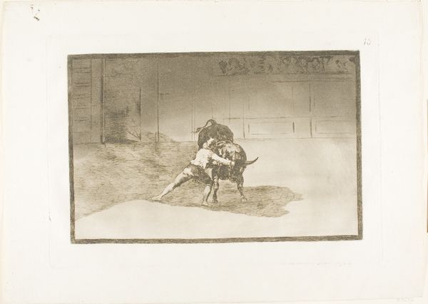 "Pedro Romero killing the halted bull" is an etching created by Francisco de Goya. The stark contrasts and sharp lines immediately draw the eye to the critical moment of confrontation between man and beast. Goya masterfully uses line and composition to convey a sense of tension. The bullfighter is depicted in a dynamic pose, poised to deliver the fatal blow. The structure of the arena, composed of horizontal bands, creates a stage for the drama, yet the etching unsettles traditional depictions of heroism through its unflinching gaze. The piece challenges our understanding of power and spectacle. The bull, though halted, exudes a raw energy, symbolizing the untamed forces of nature, while the crowd watches from above. It serves as a commentary on the human condition, reflecting on our relationship to violence, tradition, and mortality.