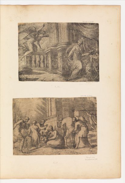 Editor: Here we have an untitled engraving on paper, likely from the 17th century, residing here at the Minneapolis Institute of Art. These crowded scenes feel like snapshots of everyday life, almost like baroque era reality TV! What’s your interpretation of these slices of history? Curator: Slices is right! They’re so dense, aren't they? I see a delightful chaos, mirroring the era's dramatic sensibilities. The Baroque loved to pile it on—emotion, detail, the works! Do you notice how the artist plays with light and shadow, even in the confined space of the print? It creates a sense of depth and almost theatrical staging. Editor: It does give that feeling of depth! Almost like a miniature stage. It makes me wonder what these stories are. Curator: Ah, that's the magic, isn’t it? Genre scenes invite speculation. Is the top one a marketplace squabble? Perhaps some teeth being pulled out? And the lower one... could be the morning after the party, a comedic mess of strewn clothes and bleary eyes! Think of them as visual poems, rather than literal transcripts of daily life. What mood do they evoke in you? Editor: Definitely comedic! I get a sense of lightheartedness, even in the lower scene with the clutter. Like they don’t take themselves too seriously. Curator: Precisely! Even amid presumed domestic chaos, there is humor. Perhaps that's the key: finding delight and stories within the mundane! What strikes you most now, after taking a closer look? Editor: That art from centuries ago, using a fairly reproducible medium, can evoke such vivid human experiences. Curator: Exactly! These works have endured for centuries precisely because of that shared humanity.