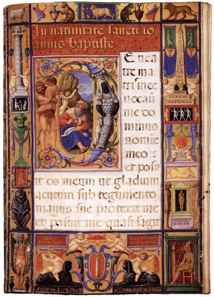 Even after printed books were common, handwritten illuminated manuscripts continued to be produced as luxury editions in the 16th and 17th centuries. This antiphonal page exemplifies the conflation of persistent medieval traditions and Renaissance secular elements. It is signed and dated on the lower frame of the miniature: 1645 Fra Bonaventura a Montepulciano fecit. Montepulciano, a provincial town near Siena, was a center of humanistic learning in the 16th century. In the historiated initial, the enthroned God the Father is encircled by a frame composed of caryatids, putti and floral festoons—all typical High Renaissance motifs. A host of symbolic animals portray the human conflict between vice and virtue, sin and redemption. The ox is a symbol of patience and strength, while the pelican represents Christ's sacrifice on the Cross and thus the sacrament of Eucharist. The ape symbolizes malice and cunning and the cat, laziness and lust, whereas the dog signifies watchfulness and fidelity. The words AD LAUDES in the cartouche at the top of the page indicate that it begins the service for lauds (about 5:00 a.m.). The words are taken from psalm 92, as noted by a later hand in the upper right-hand corner.