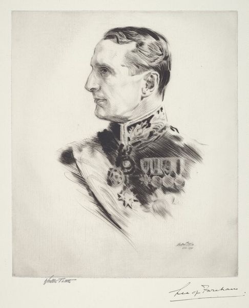 Walter Tittle made this print of His Excellency Ferdinand Foch with etching on paper. Look at the web of tiny lines that form the general’s face; they remind me of wrinkles and age, but also the painstaking detail that goes into creating a likeness. The texture is fascinating, isn't it? From the smooth, almost untouched areas, to the densely worked sections around the eyes and mustache, there's a real sense of depth and volume conjured from such simple means. The way the lines bunch together gives a weightiness to his features, especially those magnificent whiskers. Notice that the lines are not only descriptive, but also expressive, conveying the weight of command and experience. It reminds me of some of Whistler's portraits, with a similar focus on capturing the essence of the sitter through a kind of understated intensity. Art's like a conversation, right? Always borrowing and building on what came before. It invites us to look closer, to feel the presence of a person captured in a moment.