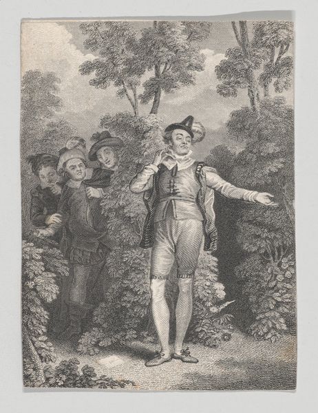 Curator: So, here we have Isaac Cruikshank’s print, "The Sportsmen's Departure," an engraving that speaks volumes, doesn’t it? Editor: It certainly does. My first impression is one of contrasts. We have tenderness with the couple near the doorway and the forward motion suggested by the hunter. It evokes a melancholy sense of leaving. Curator: Look closely at the lines – the cross-hatching to build up tone. Notice how it creates texture and suggests volume, especially in the clothing of the sportsmen, also note the method of reproduction. Cruikshank's print medium allows for a wide dissemination. Who is accessing these images, what narratives are taking hold through circulation? Editor: Yes, the circulation is key. It hints at the ritual of departure, doesn't it? This imagery, like the pointing gesture or the couple in embrace, seems charged. Departure motifs are ancient and resonant. How do you see this playing out? Curator: I see the material and labor transforming the natural world, this landscape they enter. This idealized country excursion masks what the economic realities behind those tailored suits might look like. I also think that choice of sepia connects the Romantic scene with its physical support – we understand these themes by understanding its materiality as being reproducible and disseminated. Editor: An interesting perspective, certainly. But beyond that, what is being carried through this easily disseminated artwork? It could point to longing, not just for landscape or freedom, but something within domestic relationships—the emotional tug that we see mirrored again and again in this motif. It might ask us if we're really as 'free' as this ideal proposes. Curator: Indeed. What better place than a landscape – literally etched with power relations and the economic realities of access – to have this freedom? The fact it is made with an engraving reinforces this theme of dissemination of capital in a romanticized context. Editor: So, ultimately, we find ourselves seeing departure—both in action, in meaning, and maybe even hinting at an ideal of departure for ourselves from what it is now as we experience it. Curator: A powerful symbol, yes. I like how studying the production adds new interpretations to the subject’s iconography, ultimately offering a richer account than could be achieved either approach alone.
