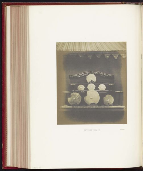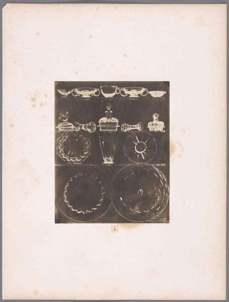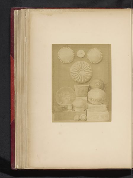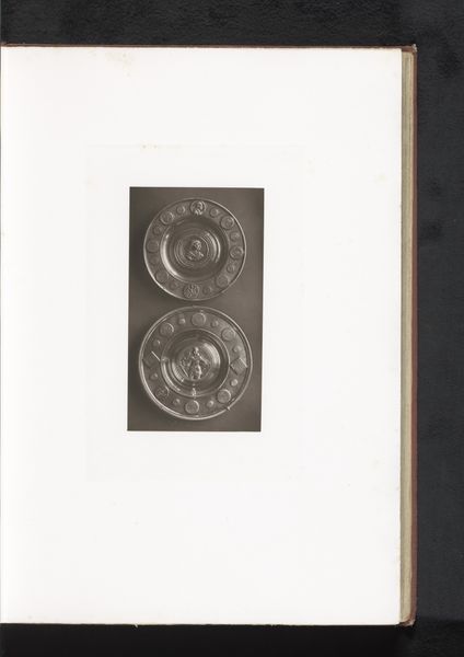 Curator: This photograph documents four decorated Italian earthenware plates exhibited in 1873 at the Exposition Rétrospective in Tours, France. It was taken by Gabriel Blaise. Editor: My first thought is, wow, there's such starkness. It’s a black and white photo, but still, you immediately get a sense of detail – you can sense the artistry of each plate, despite the monochrome. What draws you in? Curator: Well, understanding the context is key. It’s not just a pretty still life; it's a record of design. Think about the late 19th century – design was a marker of national pride and a demonstration of skill. Exhibitions like the one in Tours played a crucial role in circulating artistic ideas. Editor: Yes, absolutely. It makes me consider the original function of these plates. Were they purely decorative, signifying wealth and taste, or did they hold some other social significance within Italian culture? Curator: Likely both. These kinds of displays served to educate and influence design trends across Europe, emphasizing national identities but also, perhaps problematically, hierarchies of taste. These plates could very well carry certain traditional and conservative patriarchal messages from the Italian Risorgimento. Editor: True, these exhibitions become platforms, don't they? This makes me question, too, who this image was really for, what messages were being absorbed. It appears in some kind of album. So the photograph acts as a kind of archive in and of itself. Curator: Exactly! The image highlights a convergence of artistic movements and evolving tastes. The print makes tangible how design contributes to forming ideologies and the way photography freezes such cultural moment for reconsideration and investigation. Editor: Thinking about all these complexities has shifted my view considerably. These humble decorative plates have a far broader narrative of artistic movements and national identity, recorded here. Curator: Precisely. It's a valuable insight into understanding both the artistry of ceramics and the public function of exhibitions in shaping design culture during the period.