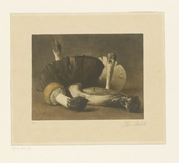Léopold Flameng created this black and white print, ‘Dode soldaat,’ using etching techniques. The composition is dominated by the horizontal figure of a dead soldier, starkly contrasted against a shadowy backdrop. The lines are etched with meticulous detail, delineating the coarse texture of the ground and the soldier's lifeless form. The stark contrast between light and shadow serves to intensify the emotional weight of the scene, emphasizing the soldier’s isolation in death. The presence of a skull and a small flying bird near the dead figure evoke a sense of mortality and the ephemeral nature of life. Flameng’s formal choices evoke deeper contemplation about the themes of mortality and the human condition in times of war. His technique destabilizes the traditional heroic depiction of soldiers, prompting viewers to confront the grimmer realities of conflict. This piece is a powerful meditation on the fragility of life, captured through its stark formal qualities and symbolic elements.