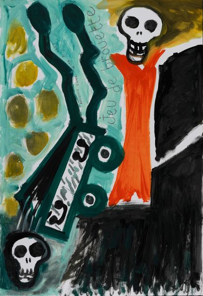 Curator: Terence La Noue's piece, entitled *The Sorcerer’s Apprentice*, presents an interesting composition. What strikes you first? Editor: The texture and layering are immediately compelling. It's not just paint on a flat surface; there's a definite sense of built-up material, almost sculptural in its approach. Curator: Indeed. Considering La Noue’s background and the socio-political climate of the late 20th century, one might view this piece as a commentary on power dynamics and the potential for misuse of knowledge. Editor: Or, stepping away from overt symbolism, maybe it's a playful exploration of color and form using collage? The red against the black, the dripped paint... the process seems as important as any message. Curator: It’s fascinating how he engages with surrealism in a way that reflects the anxieties of his time. The Tate collection offers a rich context for understanding these layered meanings. Editor: Ultimately, it makes you wonder about the physical labor involved in its creation and what materials were at La Noue's disposal. Curator: Absolutely, a thought-provoking work that resonates on multiple levels. Editor: A great example of where process and product meet.