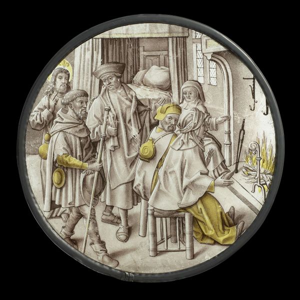Curator: Look at this roundel depicting the Planet Venus and her Children, crafted between 1517 and 1533. It is attributed to Jörg Breu the Elder. It’s an oil painting on glass. Editor: My first thought is, there’s something unsettling about the scene it portrays. It has a deceptive calm, almost like the quiet before a storm of the late Renaissance kind. Curator: Well, consider that stained glass roundels like this weren't just decorative; they were often part of complex social narratives. This piece offers a snapshot into the ideologies surrounding wealth and power. See how glass, usually associated with religious structures, is here employed for secular display? The artist transforms a sacred material to comment on terrestrial authority. Editor: Absolutely. This domestic scene reflects contemporary values and perhaps anxieties about excess, gender dynamics, and societal hierarchy, which are all relevant in a conversation of a feminist lens. Are the children blessed, or are they caught in a cycle of materialism? The expressions seem almost detached, hinting at potential downsides to worldly privilege. Curator: I agree, and if you look closely, the figures are individualized. There's meticulous detailing in the drapery and expressions—evidence of careful craftsmanship. Also, oil painting on glass! The material challenges must have been intense, suggesting specialized skill and equipment. It reflects a competitive workshop culture where technical excellence could determine patronage. Editor: Also note how race intersects with status in this visual field: these very white figures partake in very comfortable surroundings. Where is race in all of this luxury, which could have emerged due to some imperial expansion and wealth consolidation happening at the time? The narrative becomes an exclusive visual dialogue, and how complicit is this representation? Curator: Right, such artworks were never just passive objects; they played an active role in shaping, sometimes re-shaping, social structures. Considering that the work is made of pigment and glass in an early modern workshop, seeing the artist's process and material agency embedded within it emphasizes that art making can serve and question powerful interests. Editor: Indeed. Thank you for this artful unearthing. Curator: A fascinating analysis! It makes you see so much more.