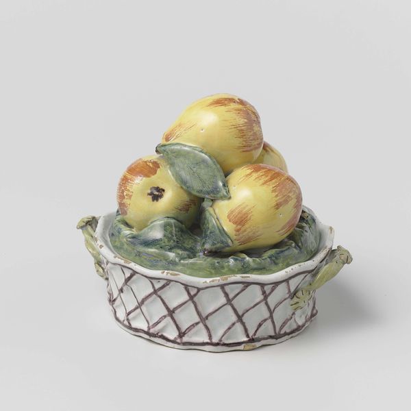 This is a decorative tea caddy, crafted by the Weesper porseleinfabriek, featuring a multicolored landscape set within a geometric pattern. In the 18th century, tea was not merely a beverage; it was a ritual, an emblem of status. Porcelain tea caddies such as this one, became a canvas for expressing societal values. Notice how the landscapes, idyllic and serene, offer a sense of escape and reflect the cultural fascination with nature. Consider what it means to frame this imagined nature within the rigid geometric lines. The pink glaze, delicate and feminine, invites questions about gender and taste. Who was this object made for, and what narratives of beauty and domesticity does it uphold? What conversations took place around it? The tea caddy becomes a quiet yet powerful commentator on its time. It shapes our understanding of what was valued, what was desired, and ultimately, how identity was constructed through material culture.
