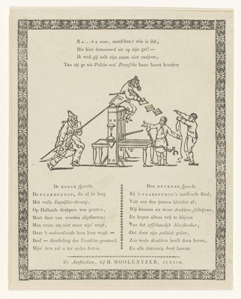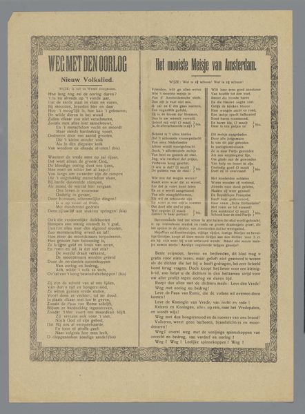 Curator: We are standing before “Vers geschreven door J.B.F. van Gogh voor zijn executie, 1778,” a print on paper and textile dating back to 1778. The text is prominent, featuring decorative borders and a central poem in Dutch. Editor: My first impression is stark and mournful, a grim reminder of mortality. The typography lends a certain gravitas. Curator: Indeed. The piece’s power lies in its association with a condemned individual facing execution. "Written in the Chamber of Mourning," the title proclaims, instantly setting a tragic, socially loaded stage. What significance do you find in the fact that van Gogh names this poem in relation to a Treurkamer – which is to say, Chamber of Mourning? Editor: I am drawn to the physical properties—the paper and textile which are used to distribute what appears to be an otherwise individualized expression. And what does it mean for the production and dissemination of knowledge if the medium is impermanent – paper that may fade, fabric that may tear? There’s an inherent tension there, which points to material processes that amplify the class disparities, and precarity of, authorship. Curator: Absolutely, the intersection of text and textile also invokes the socio-political realities surrounding the artwork’s very means of production. Let's consider the possible gender implications too. One question I have relates to the intersection between author, printer and “Hoer,” or, the ‘Whore’ spoken of at length in the poem – Editor: Right, it appears the "Hoer," is portrayed as deceitful: "...though only lies inwardly laughed" is a telling line, and highlights a dynamic in which one set of subjects may access the domain of Reason. Curator: Van Gogh uses classical references to reinforce conventional standards: 'Neither Samson, Hercules, may sway,' as one reads, in opposition to the lies of the “Hoer.” So the poem suggests some tension. I notice you lingering over by that final printed flourish! Editor: The details surrounding the printer matter here! Note: "By Johannes Seggeren and Son, Bookmakers in de Gravestraat” This suggests that social institutions and power are linked not only through the act of producing text but are, literally and concretely, located at specific sites of labor. Curator: I find the fusion of personal narrative and historical moment profoundly stirring. It encapsulates the personal suffering inflicted on the figure in question and society’s complex social power dynamics that continue to impact people. Editor: Yes, it really highlights the layers of production—social, textual, material—in this seemingly simple document of despair.