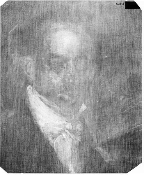 Editor: So, this is an X-radiograph of "Dan Waldo Junior," after a painting by Chester Harding, from the Harvard Art Museums. It's fascinating to see beneath the surface like this. What can we learn from this image? Curator: This x-ray reveals the unseen, not just of this particular portrait, but the very institutional framework that supports art history. Who decided to x-ray this painting, and why? Editor: So the process of examining it reflects the institution's values? Curator: Exactly! What questions were they hoping to answer? Conservation? Authentication? This image is as much about what we choose to reveal as it is about what Harding originally created. Editor: That's a new way to look at art—thinking about who gets to look and why. Curator: Precisely. The x-ray exposes not just the artist’s hand, but the institution’s agenda.