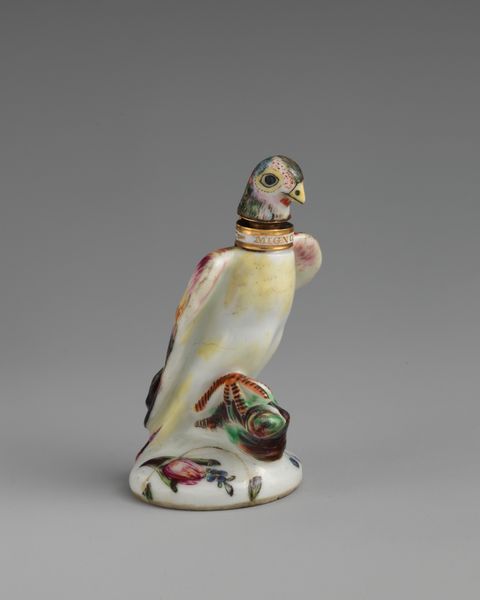 Editor: Here we have a porcelain sculpture of a "Parrot" made around 1745-1760 by the Saint James's Factory. It's incredibly detailed, yet feels quite small and delicate. How do you interpret this piece, especially considering its historical context? Curator: That’s a keen observation. We must consider the socio-political backdrop. This era witnessed burgeoning global trade and colonial expansion. How might the presence of an exotic bird like a parrot, meticulously rendered in porcelain, reflect Britain’s colonial ambitions and its relationship to the natural world? Editor: I see what you mean. It’s not just a pretty object, but a symbol of something larger. Like, the bird itself represents a captured piece of another land? Curator: Precisely. Luxury goods, like porcelain, were often linked to colonial exploitation. The parrot, in its vibrant otherness, becomes a decorative emblem of the Empire's reach and power. Consider how access to and control of resources were expressions of wealth and status during this time. Does that change how we look at its diminutive size? Editor: Absolutely. It makes me question the hands that created it and those who consumed it. So, this "Parrot," beyond its aesthetic appeal, invites us to think critically about power, representation, and the legacy of colonialism embedded within art. Curator: Exactly. This sculpture can serve as a catalyst for examining Britain’s evolving identity and the complicated dynamics of its interactions with the wider world. What have you learned today? Editor: How even seemingly simple artworks hold layers of social and political meaning once you begin unpacking them! Curator: And how approaching art with a critical lens can reveal those deeper truths.