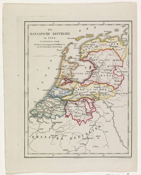 Editor: Here we have "Kaart van Nederland, 1701" by Harmanus van Loon, created in 1701. It's an engraving, and I’m struck by how meticulously detailed the lines are; it’s quite an intricate composition. What do you see in this piece from a formalist point of view? Curator: From a formalist lens, the strength of this piece resides primarily in its complex deployment of line and plane. Note how Van Loon articulates depth not through traditional atmospheric perspective, but through a flattening of space. The linear quality emphasizes shape. Notice the cartographic information presented functions as geometric form. Editor: It is very precise in its representation. Curator: Consider, also, how the title cartouche, replete with flourishes, serves as a counterpoint to the ordered representation of space. The flourishes in the title offer an almost excessive ornamentation. Does this create a tension, in your view, within the overall design? Editor: It does; the cartouche feels almost separate from the rest of the composition because of its complexity. While the overall composition adheres to more conventional standards of line work to depict place, it emphasizes this area prominently via intricate design work. Curator: Exactly. The use of distinct styles—detailed linearity with exuberant ornamentation—demonstrates that tension. One wonders how this intentional deployment of styles enhances, or detracts from, its legibility as a “map”. Editor: I hadn't thought about the contrast like that. Considering the different methods used to achieve this composition emphasizes its intent as an engraving as well as its more practical elements. Curator: Yes, and by analyzing these structural contrasts, we begin to decipher how visual hierarchy might work to alter and complicate this relationship.
