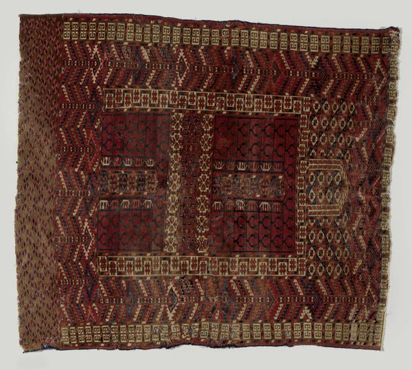 Curator: This captivating textile is a Tampan, or ceremonial cloth, from the Paminggir region, likely dating back to the 19th century. Editor: It strikes me immediately with its sophisticated geometric patterning. The careful arrangement of those interlocking shapes is quite mesmerizing. Curator: Indeed. Tampans like this were crucial within Paminggir society. They served as gifts during life-cycle rituals and ceremonies. They were deeply woven into their social fabric, symbolizing community and connection. Editor: The choice of a square format is very interesting; it immediately gives a sense of contained space, a world unto itself with its clearly defined borders. Also, the palette is very restrained and grounding—a triad of earth tones dominates, lending a solemn quality to the piece. Curator: These cloths were specifically exchanged during transitions: births, weddings, and even deaths. They facilitated the transition from one state of being to another and held significant meaning related to social obligations. We believe these cloths also regulated social interactions during community feasts, indicating a shared visual language of meaning and decorum. Editor: You mention this textile embodies meaning through transitions, and I see visual support for that argument. Look at how each chromatic block is separated from the other by intricate geometric borders that echo throughout the work. The borders work like frames containing visual movement but never stopping the eye completely, guiding the observer into another frame of the design. It feels active, rather than stagnant. Curator: It's precisely that active quality which played a role in maintaining and signifying social bonds. These designs, while abstract to our eyes, contained powerful iconographic meaning understood within the community. The Art Institute of Chicago holds this object in their collection as a fine specimen of south east Asian woven material traditions, adding to its modern-day value. Editor: And considered purely from a formal perspective, this textile manages to reconcile this idea of containing motion; the interplay between the individual unit of geometric figures to the overall design creates a fascinating dynamic to the otherwise straightforward composition. Curator: It makes you wonder what those particular symbols meant to those exchanging the cloths centuries ago. Perhaps, in contemplating the unknown, we gain our own symbolic interpretation as viewers today. Editor: Precisely, a beautiful convergence of intention and form. I leave with a richer perspective than I began with.
