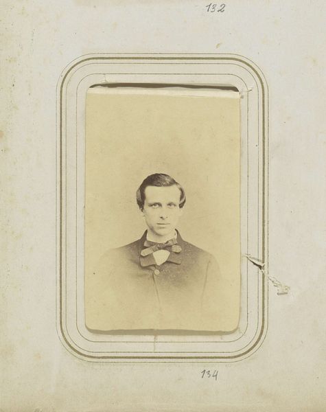Curator: Let’s take a look at this photograph, entitled "Portret van W.J.M. Asmus met een handschoen in de hand," likely from 1862. It is made using the gelatin silver process, a technique very prevalent in that period for its capacity to produce highly detailed and reproducible images. Editor: My first thought? What a beautifully haunting face. The lighting gives him this sort of ethereal glow, even with that slightly awkward, posed stance. You just wonder what he was truly like. Curator: The awkwardness, I believe, arises precisely from the performative aspects inherent in early photography. It wasn’t simply about capturing a likeness; it was about projecting a certain social standing and respectability through meticulous staging and the careful control of material presentation: note the single glove and studied gaze. Editor: A glove casually held speaks volumes, doesn't it? I picture the studio buzzing with deliberation over this small detail. What narrative do we build with the glove? Is it a subtle nod to a profession? Or purely aesthetic? It certainly adds an aura of intrigue. Curator: Indeed. Think of the social implications of glove-wearing then! Cleanliness, gentility, separation from manual labour. This image would have involved complex negotiation involving pose, attire, the cost and labour involved in its production, and its intended circulation. Gelatin silver prints democratized photographic portraits, but not entirely, which is telling here. Editor: Knowing this democratizing technology served to bolster certain notions about class fascinates me. What seems frozen and permanent actually vibrates with social tensions—and maybe this is a projection but it's as if this man somehow suspects it, and this is precisely where the melancholic allure emerges from. It also creates a contrast to think about who would not have the means to take this sort of portrait. Curator: Absolutely. And understanding photography's relationship with broader socio-economic contexts gives new dimensions to how we appreciate these "portraits". It highlights the intersection of art, technology, and the politics of representation. Editor: I’ll now look at these photographic works with fresh eyes. Thinking of it that way moves the image in time.