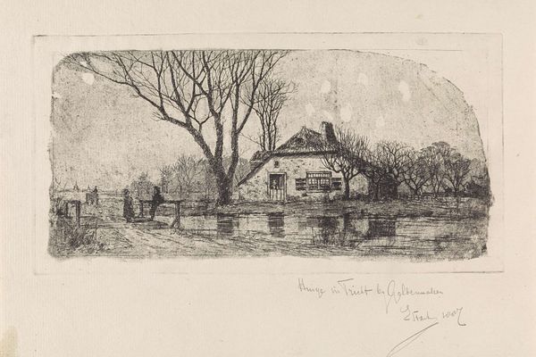 This is an etching of a 'Polderhuis met de sluis in Boerenwetering te Amsterdam’ by Frans Schikkinger. It's made using etching, a printmaking technique where a metal plate is coated with wax, a design is scratched into the wax, and then acid is used to bite into the exposed metal. The materiality of the metal plate, the precision of the etching needle, and the corrosive action of the acid, all contribute to the image's appearance. Look at the fine lines, the delicate hatching, and the subtle tonal variations. These are achieved through carefully controlled chemical processes. The artist has used their skill to capture a sense of place and atmosphere. But consider that etching itself is also an industrial process, demanding skilled labor and the use of specialized materials. The print you see here is both a work of art, and evidence of a complex network of production and consumption. Appreciating this context allows us to see the image not just as a representation, but as a product of its time.