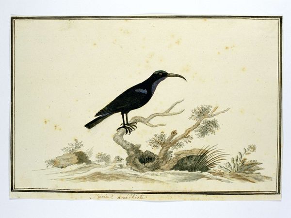 Editor: Here we have Robert Jacob Gordon's watercolor from around 1778, "Telephorus zeylonus (Bokmakierie)." It's a simple composition: a bird perched on a branch, depicted with delicate detail. What do you see in this piece? Curator: I see a representation deeply embedded within the colonial gaze of the late 18th century. Gordon, as a military commander in the Dutch East India Company, wasn't just creating a naturalist study; he was cataloging resources and asserting a kind of ownership over the land and its inhabitants. Editor: Ownership? So, the image is more than just a pretty bird picture? Curator: Precisely. Think about who this image was created for – likely a European audience eager to consume knowledge about the exotic "other." Consider the act of naming: assigning the bird a European name. It's an act of claiming and controlling the natural world. We have to question how scientific illustration like this perpetuated unequal power structures by stripping the land of its indigenous identities. What do you think the lack of context does? Editor: It makes the picture seem… disconnected. It removes the bird from its habitat, its relationship to everything around it. Curator: Exactly. It becomes an isolated specimen, a symbol of colonial power separating it from any historical or environmental relationships. How does seeing it in this way affect your interpretation? Editor: I guess I hadn't thought about the ethics of seeing nature this way. I was just looking at a bird, now I realize it's charged with so much more than meets the eye. Curator: It shows us that representation is never neutral. We always have to consider the historical context and who gets to tell the story.