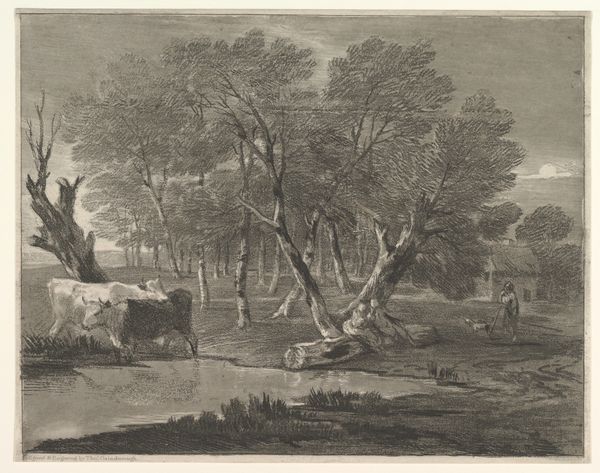 Curator: Ah, another lovely find. This is "Thorn, Willow, Beech and Birch, from The Park and the Forest," a lithograph on paper created around 1841 by James Duffield Harding, presently held here at the Art Institute of Chicago. What are your initial thoughts? Editor: Peaceful. Quiet. Very still. I almost feel the urge to meditate just by gazing at those cows enjoying the water, but those aren't just any cows, look at the size of their horns. I feel I need a good ale and pipe. The image makes me want to wrap up in a blanket next to a roaring fireplace on a cool evening. Curator: That's the Romantic spirit shining through! Harding certainly captured that feeling of serene beauty. But beyond that, consider the lithographic technique. Notice the density of the shading; the cross-hatching to achieve a depth. The textures within the foliage give you almost a hyper-realistic understanding of Romantic-era English pastoral work. Editor: That realism definitely helps create that very lived-in feeling. There’s something incredibly familiar here. Perhaps it’s the careful balance of light and shadow that he seems to embrace in an un-dramatic form of expression. Like walking in the country when the wind has died down. Even the lack of human element enhances that connection somehow. Curator: Precisely! Harding was incredibly skilled in his use of tonality. Each plant, rock and hoof has a carefully assigned luminosity. In terms of visual weight, the lighter tree canopies on the right balance with the heavier foliage in the left corner; even the animals guide the eye from dark to light and back again. Editor: I hadn't noticed those careful compositional cues; very subtly arranged. So the stillness is a result of more than just subject matter. Clever. You feel yourself relaxing under those limbs and leaves! Harding really did invite us to experience this calm that the cattle express without any other artifice than a quiet observation, Curator: Absolutely. There's an invitation for introspection, an understated grandeur—a lovely slice of the countryside brought to us in a form accessible and, dare I say, rather democratic for its time. Editor: Well said! I might just seek this one out again later today. It would do me good, and you as well perhaps.