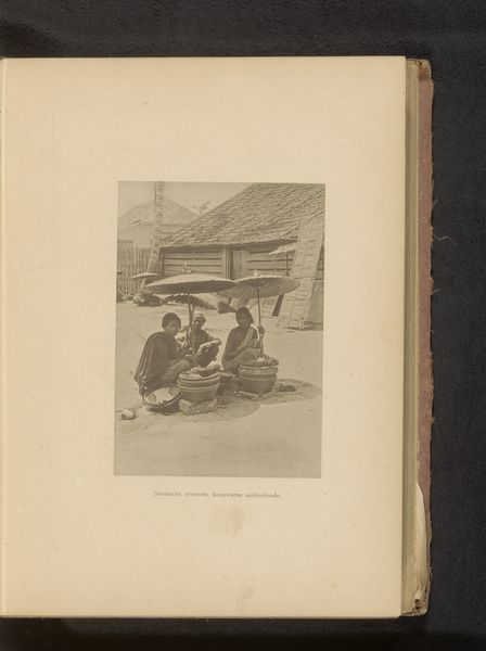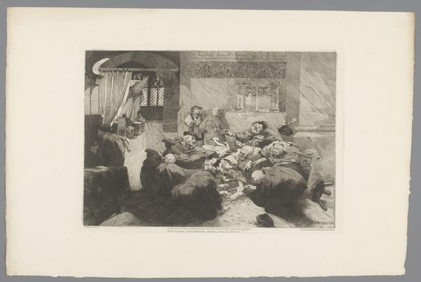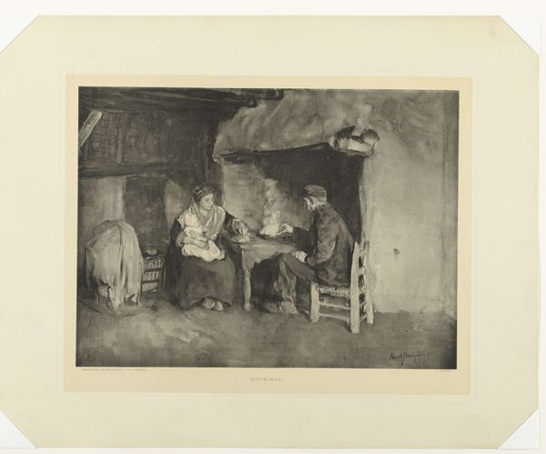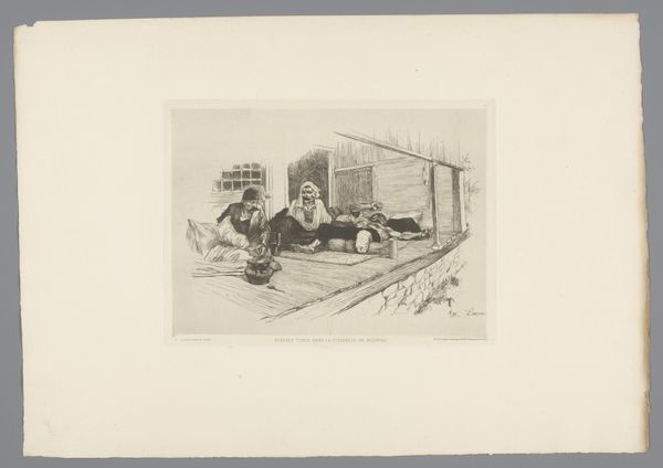 Curator: Oh, this etching immediately draws you in, doesn't it? Look at those stark blacks and grays! Editor: It's intriguing, this sense of debate. I feel I am seeing into the kind of hushed arguments that happen in corners everywhere. Is there some sort of melancholy present here? Curator: Indeed, I know what you mean. Let’s delve deeper into it. This etching on paper is titled "Vier mannen aan tafel op een terras" by J. Payrau and thought to be made sometime between 1875 and 1894. Editor: "Four men at a table on a terrace"—simple, almost prosaic. Yet, look at the tonal variations! Payrau masterfully employs light and shadow to define each figure, particularly how the man on the right has some weapon there; resting peacefully by the table. I'm interested in what the meaning might be in that addition. It almost takes on a silent symbolic status through this very deliberate pose! Curator: Yes, exactly, he definitely appears almost frozen, deep in thought. Considering it falls loosely within the Realism movement, it strives for authenticity above all else, but those kinds of compositions can allow you into seeing inside of yourself, you know? I find myself questioning the narrative implied, trying to listen in to their debate... And their hats. What's with all those incredible hats! Editor: Observe how the foreground leads us directly to their meeting and it frames our field of view while the backdrop shows only blurred objects giving viewers focus on what's on that table with these people.. It is also monochrome and gives me nostalgic emotions as though I saw one painting about family from way back, but what kind could bring back such feelings? Curator: The emotional weight lies not in grand gestures but in the subtle interplay of expressions and that careful arrangement that allows us into something about them - I love it! It whispers a narrative. Editor: Ultimately, this etching by J. Payrau isn't just an arrangement of lines and shapes, this isn't only how the composition influences perspective – it's a lens through which the emotional resonance makes an entire statement about human existence, in essence!.